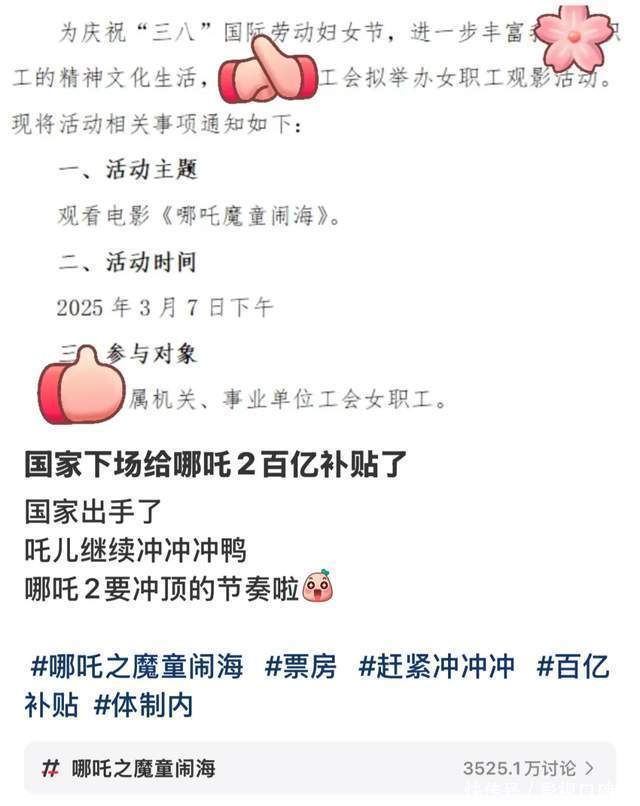 以往我们能够看到,全国各大体制内相关单位工会有习惯组织员工共同去看主旋律题材的电影,个人组织和民营企业也会有时候发放电影兑换券作为员工福利。看着一部如此为国争光,主流媒体纷纷下场力捧的电影。果然,有大组织开始集体下场了。